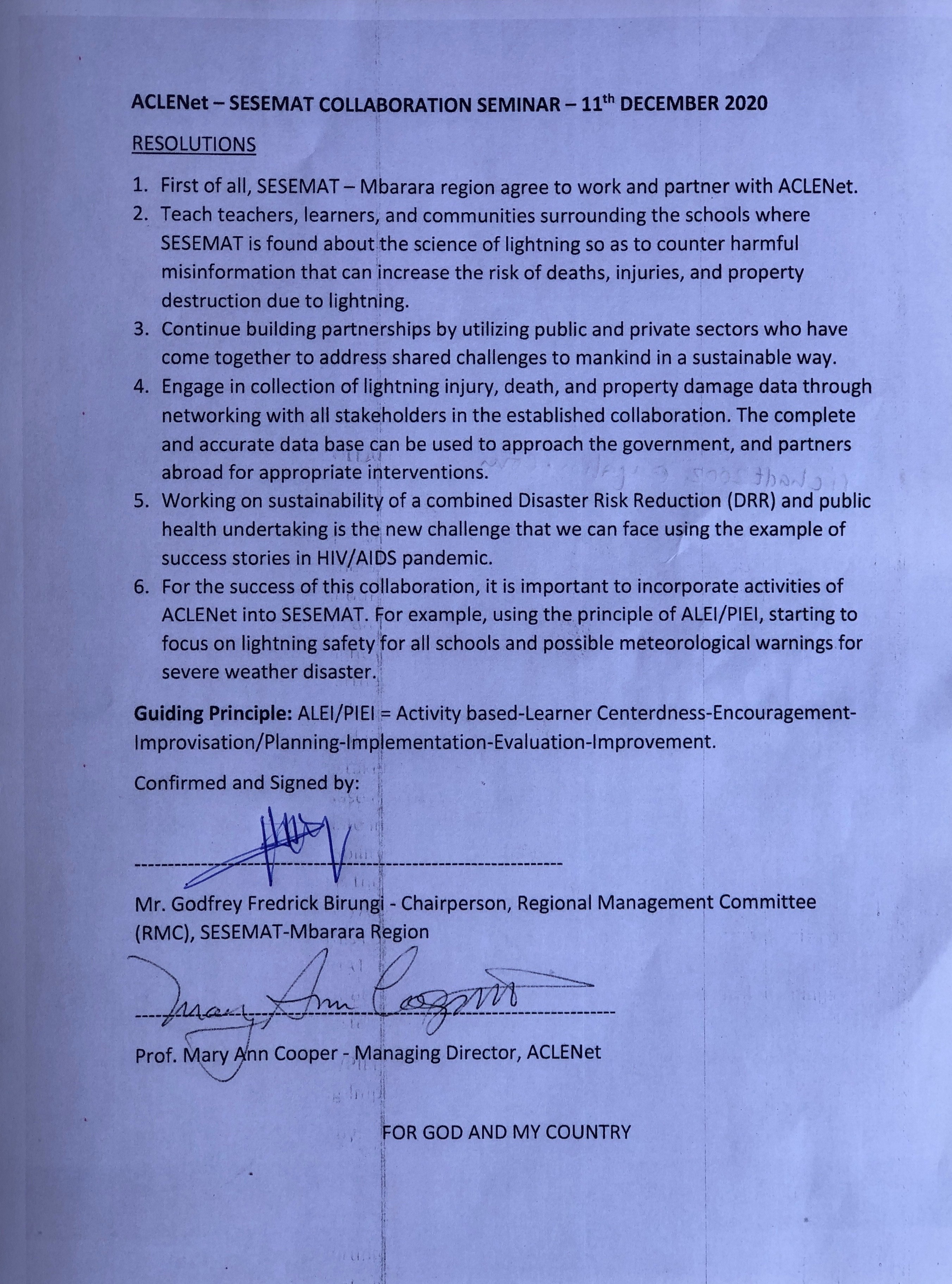 ACLENet has signed an agreement with the Uganda Secondary Science and Mathematics Teachers (SESEMAT) program within the Ministry of Education and Sports to do a pilot program Training the Trainers who then train pilot region's grassroots science teachers, bringing scientific education to the classrooms of their schools and students. Additionally, as leaders in their communities, we are asking them to report all of the lightning incidents they hear of in their areas in order to pilot a lightning injury database superior to what we have been able to collect from news reports alone.